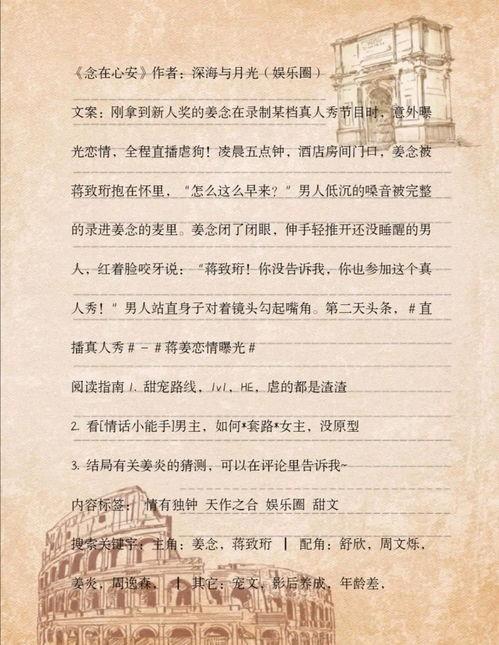 所以,亲爱的你,如果也想了解娱乐圈的真相,不妨去看看这篇推文小说。相信我,它一定会给你带来意想不到的收获。毕竟,生活就像一本小说,只有亲自翻开,才能找到属于自己的故事。